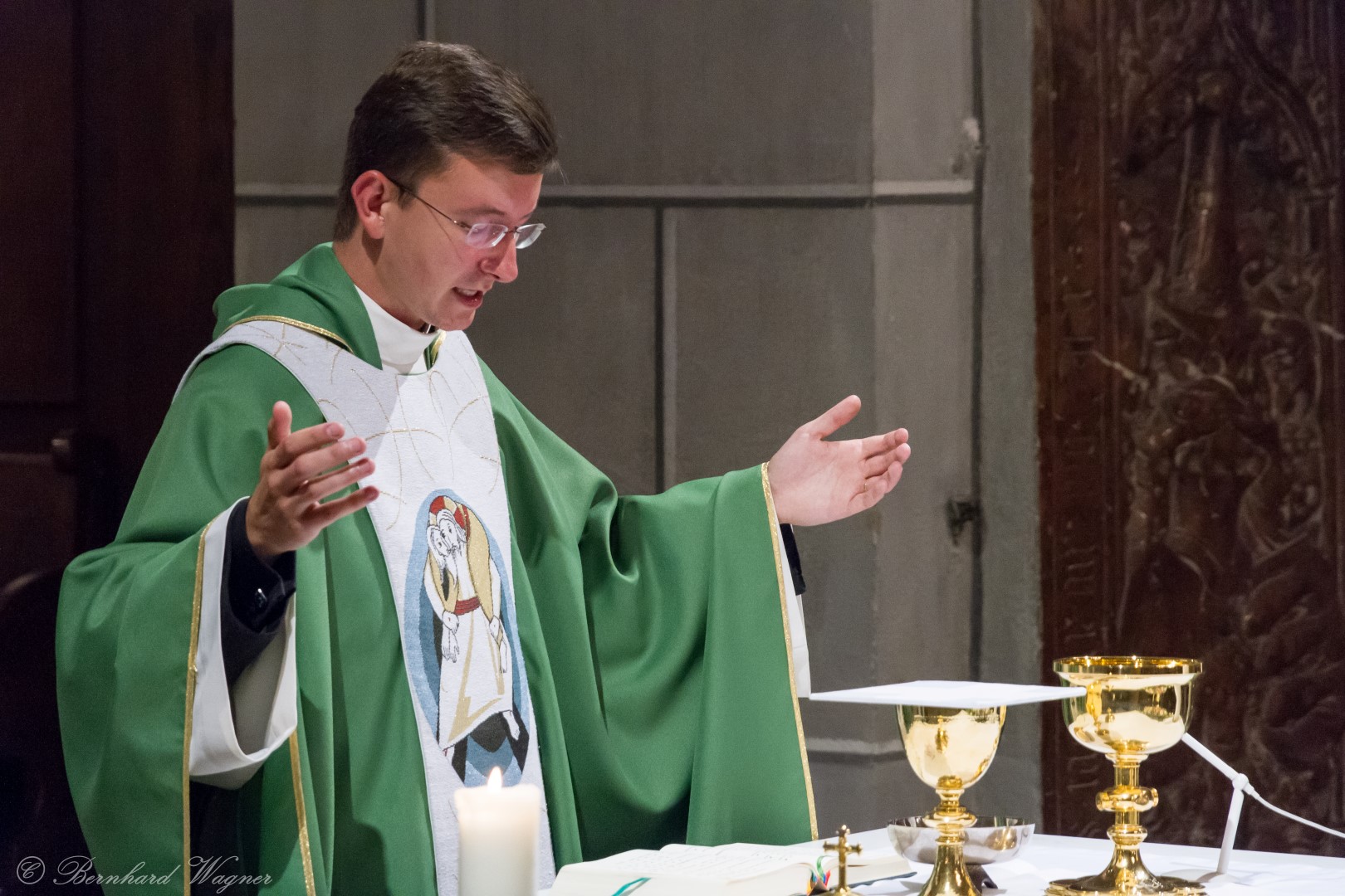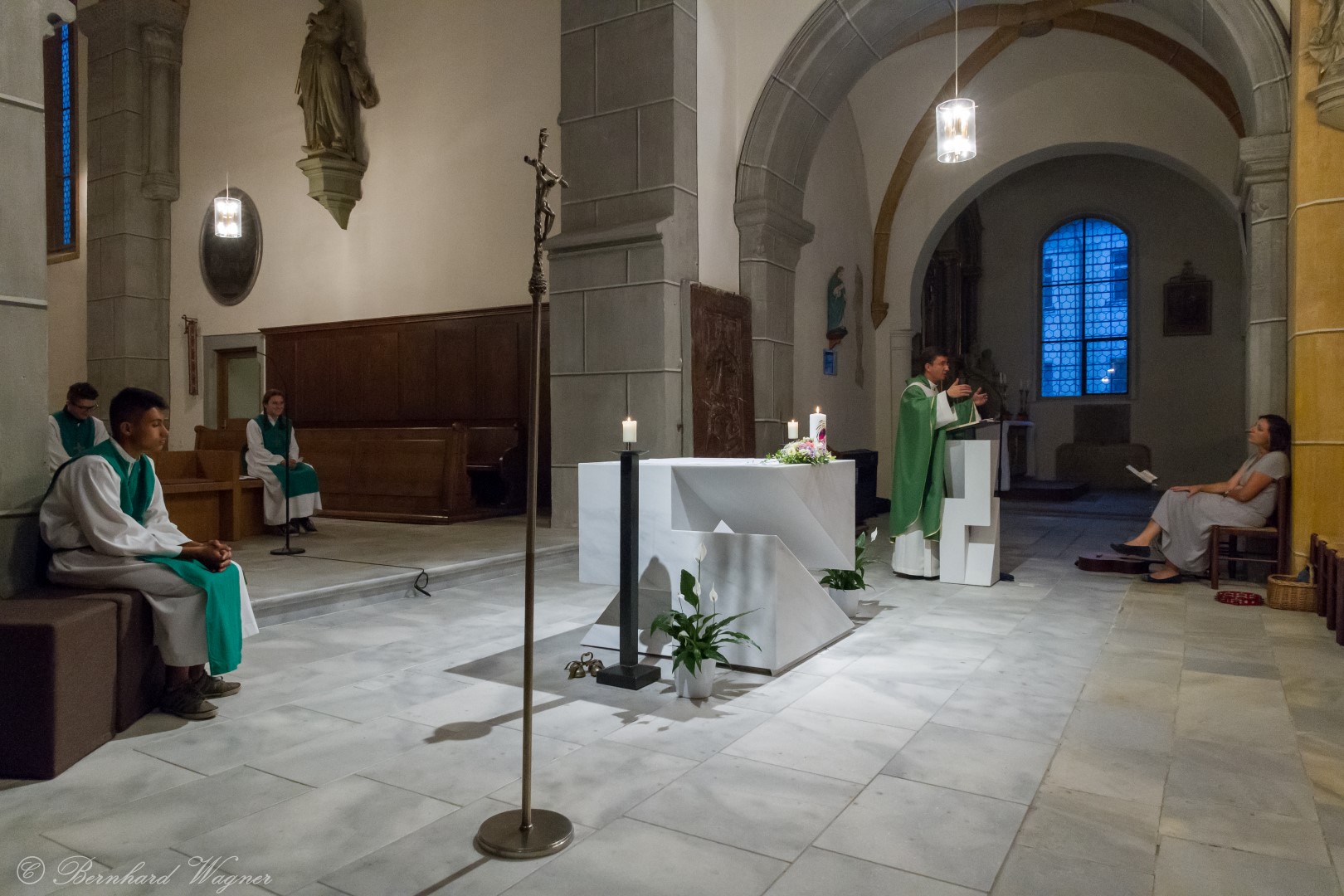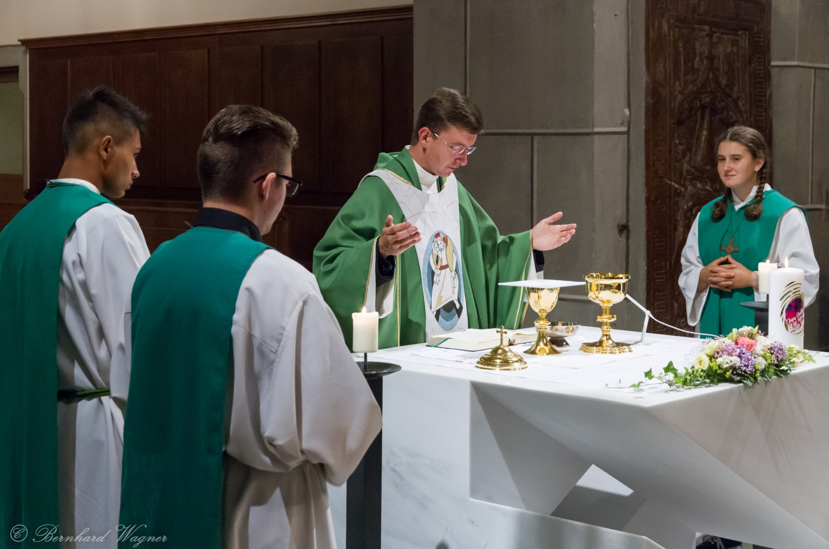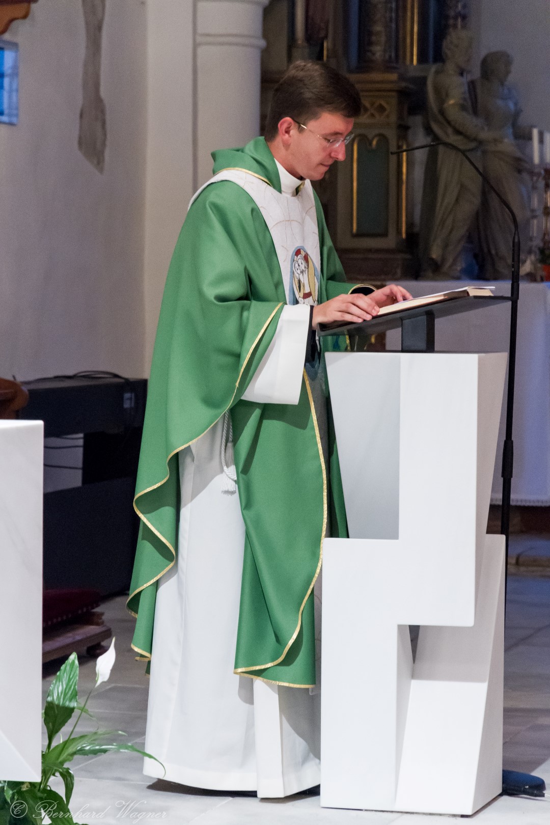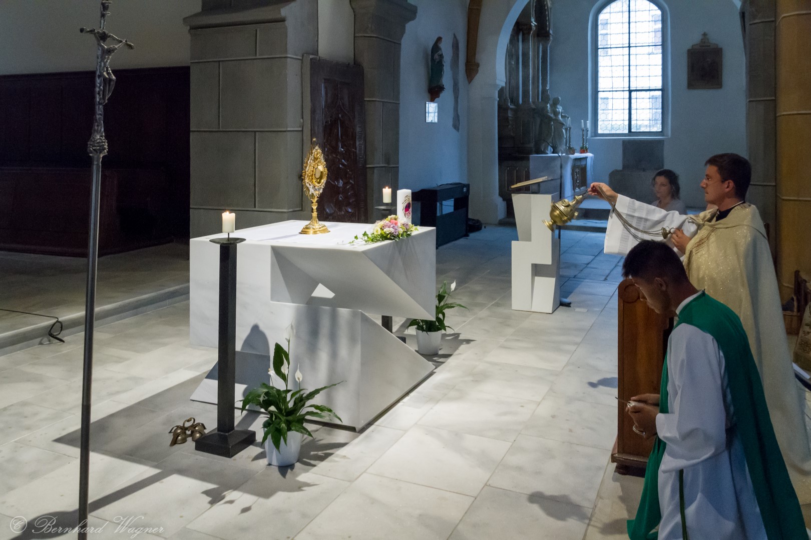 Nach der Begrüßung der anwesenden Gläubigen durch Kaplan Kranicki übertrug er das Allerheiligste in der Monstranz zum Volksaltar und nahm anschließend die Inzens, also eine feierliche Beräucherung, vor. Es folgte die festliche Eröffnung der Feier mit dem bekannten Lied „Großer Gott, wir loben dich”, an der Orgel gespielt durch Organistin Frau Christina Kaufmann, ehe man sich ganz in die Anbetung des Allerheiligsten mit verschiedenen Gebeten, betrachtenden Texten und Liedern vertiefte. Die musikalische Gestaltung übernahm dabei Pastoralassistentin und Krankenhausseelsorgerin Frau Eva-Maria Kölbl-Perner mit verschiedenen Gesängen, u.a. auch solchen aus Taizé, welche sie an ihrer Gitarre begleitete. Zum Abschluss des ersten Teils beteten Jugendliche den Barmherzigen Rosenkranz.