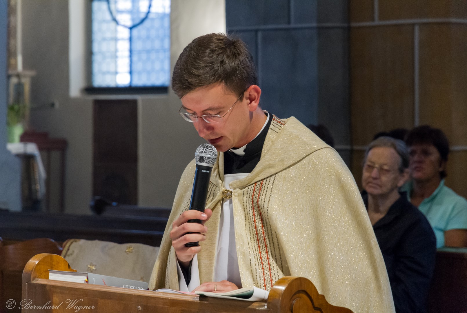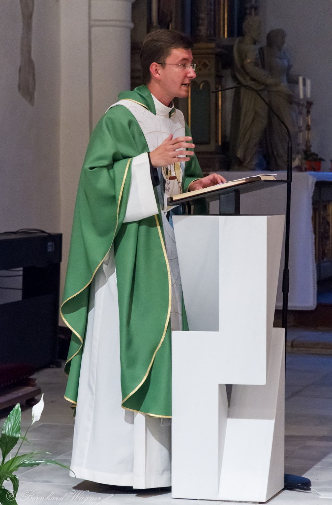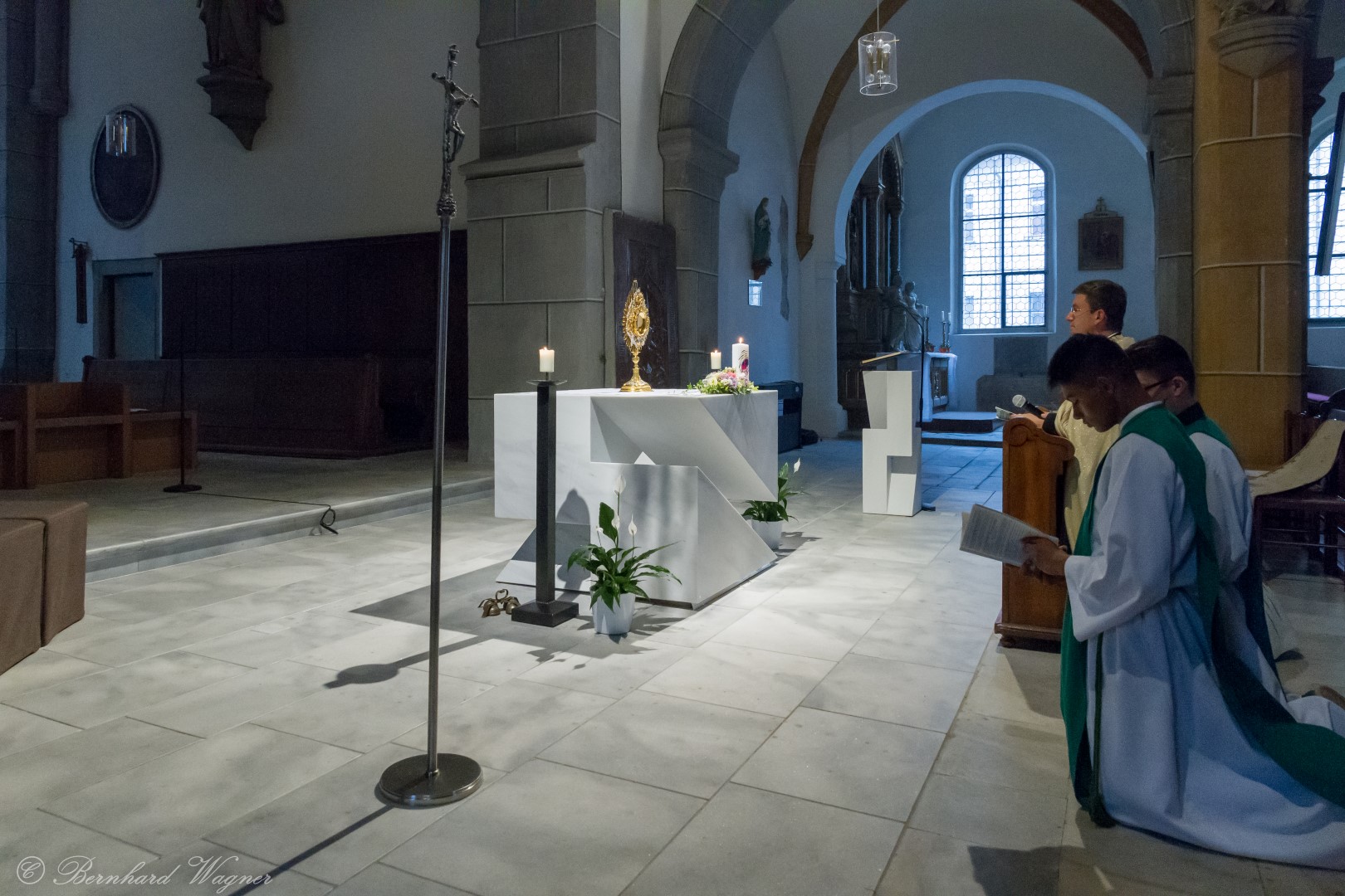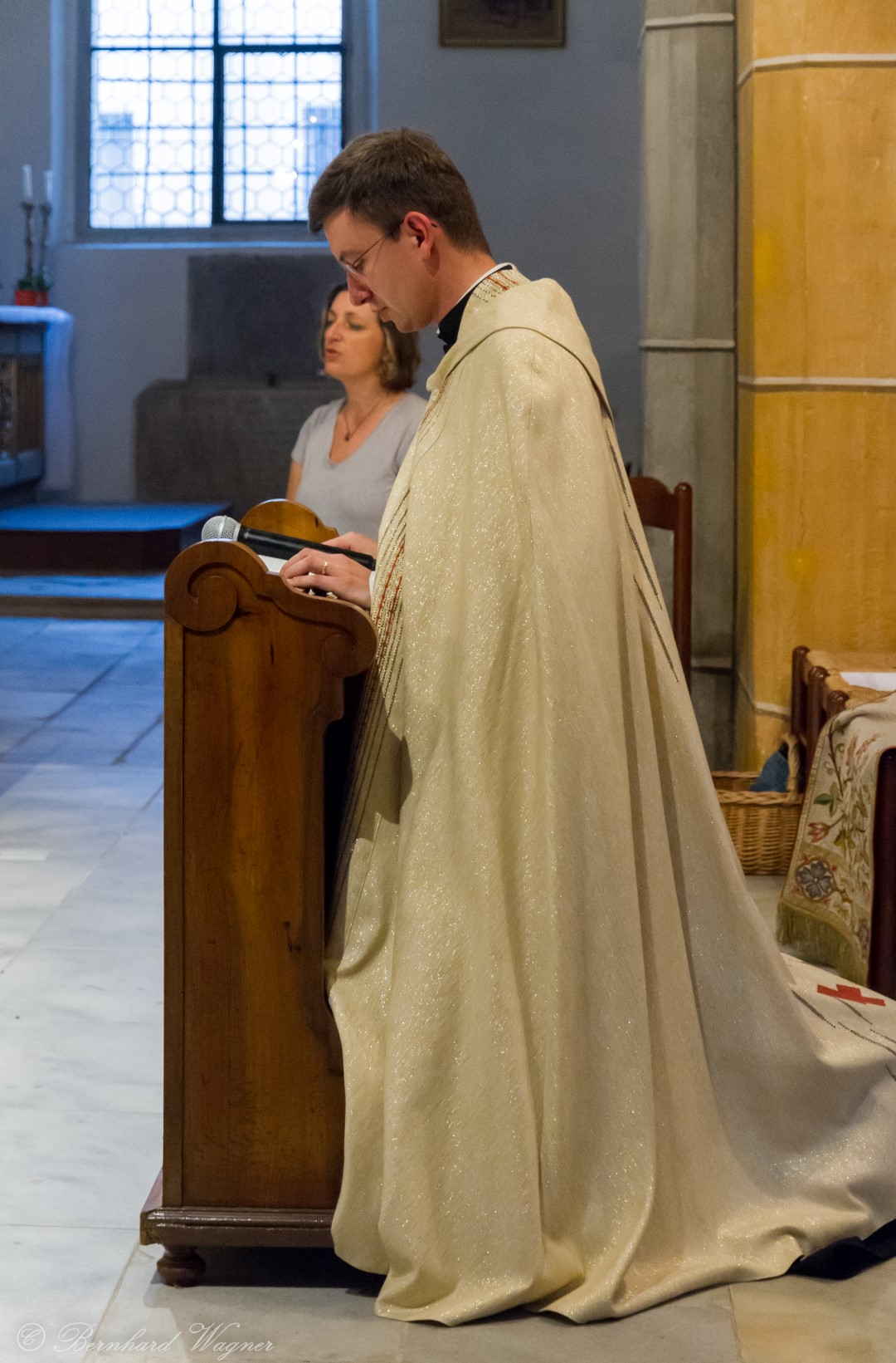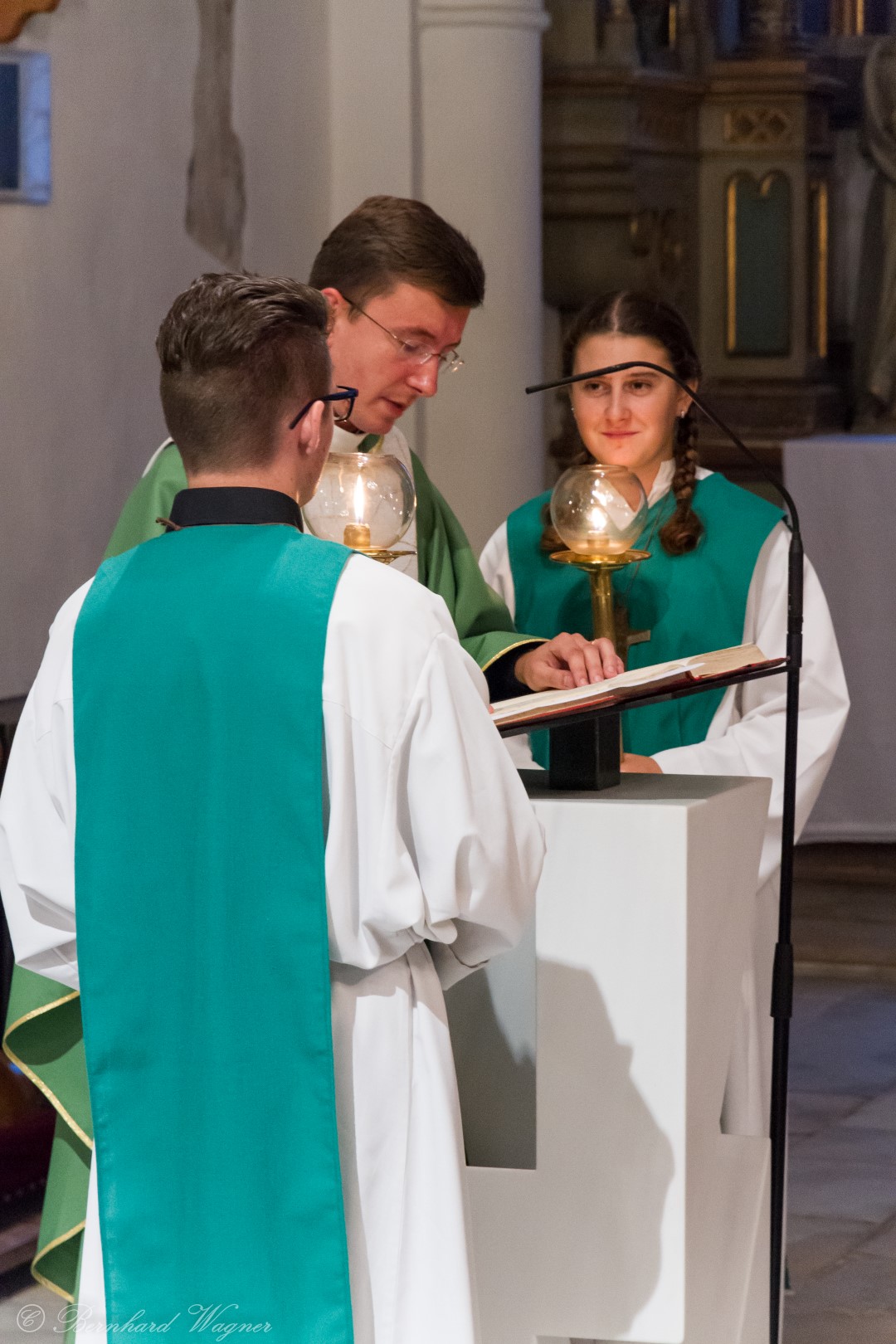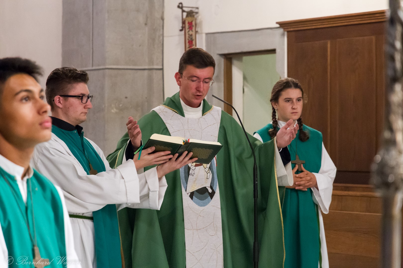 Nach der Begrüßung der anwesenden Gläubigen durch Kaplan Kranicki übertrug er das Allerheiligste in der Monstranz zum Volksaltar und nahm anschließend die Inzens, also eine feierliche Beräucherung, vor. Es folgte die festliche Eröffnung der Feier mit dem bekannten Lied „Großer Gott, wir loben dich”, an der Orgel gespielt durch Organistin Frau Christina Kaufmann, ehe man sich ganz in die Anbetung des Allerheiligsten mit verschiedenen Gebeten, betrachtenden Texten und Liedern vertiefte. Die musikalische Gestaltung übernahm dabei Pastoralassistentin und Krankenhausseelsorgerin Frau Eva-Maria Kölbl-Perner mit verschiedenen Gesängen, u.a. auch solchen aus Taizé, welche sie an ihrer Gitarre begleitete. Zum Abschluss des ersten Teils beteten Jugendliche den Barmherzigen Rosenkranz.