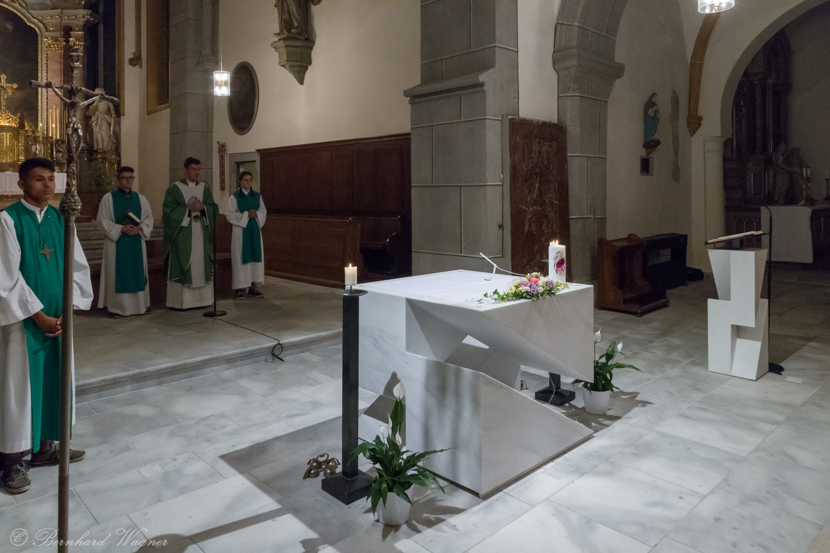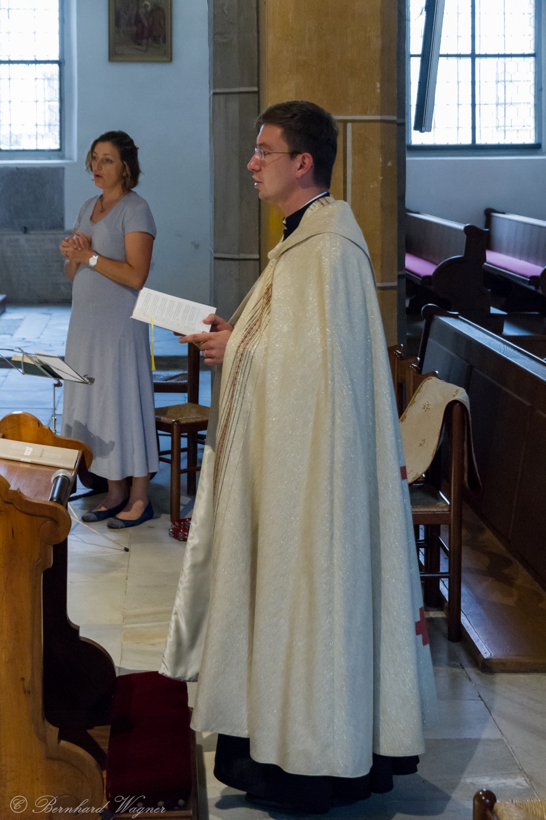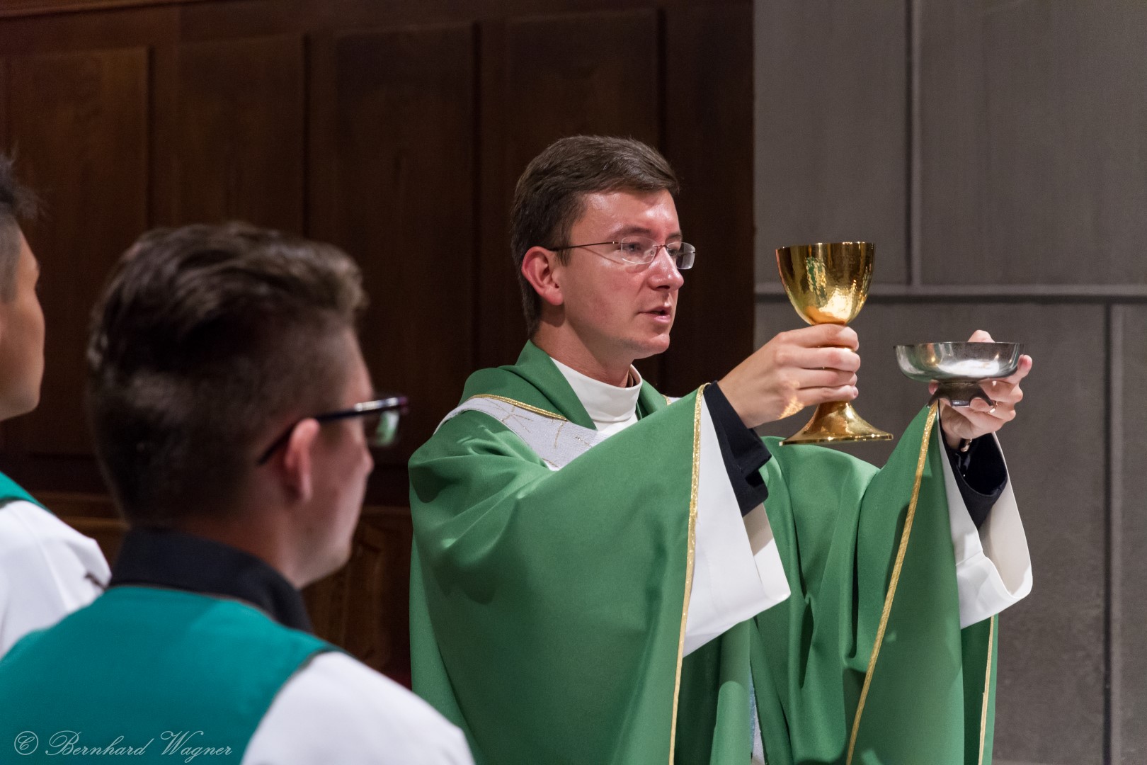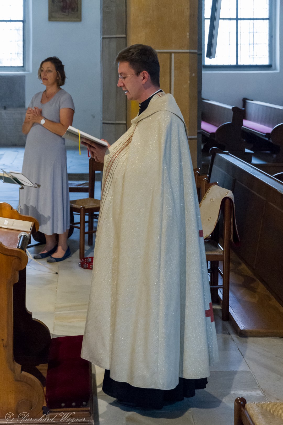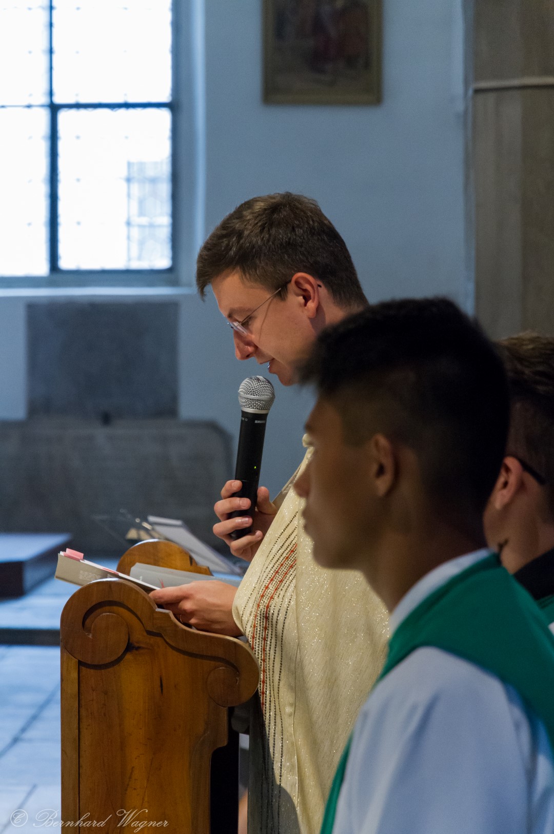 Nach der Begrüßung der anwesenden Gläubigen durch Kaplan Kranicki übertrug er das Allerheiligste in der Monstranz zum Volksaltar und nahm anschließend die Inzens, also eine feierliche Beräucherung, vor. Es folgte die festliche Eröffnung der Feier mit dem bekannten Lied „Großer Gott, wir loben dich”, an der Orgel gespielt durch Organistin Frau Christina Kaufmann, ehe man sich ganz in die Anbetung des Allerheiligsten mit verschiedenen Gebeten, betrachtenden Texten und Liedern vertiefte. Die musikalische Gestaltung übernahm dabei Pastoralassistentin und Krankenhausseelsorgerin Frau Eva-Maria Kölbl-Perner mit verschiedenen Gesängen, u.a. auch solchen aus Taizé, welche sie an ihrer Gitarre begleitete. Zum Abschluss des ersten Teils beteten Jugendliche den Barmherzigen Rosenkranz.