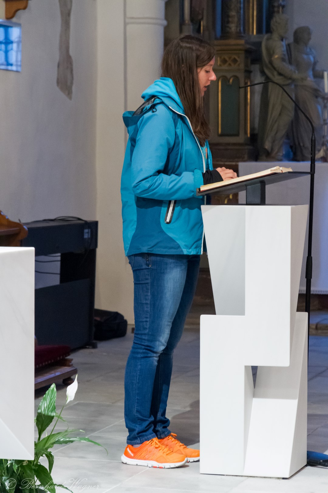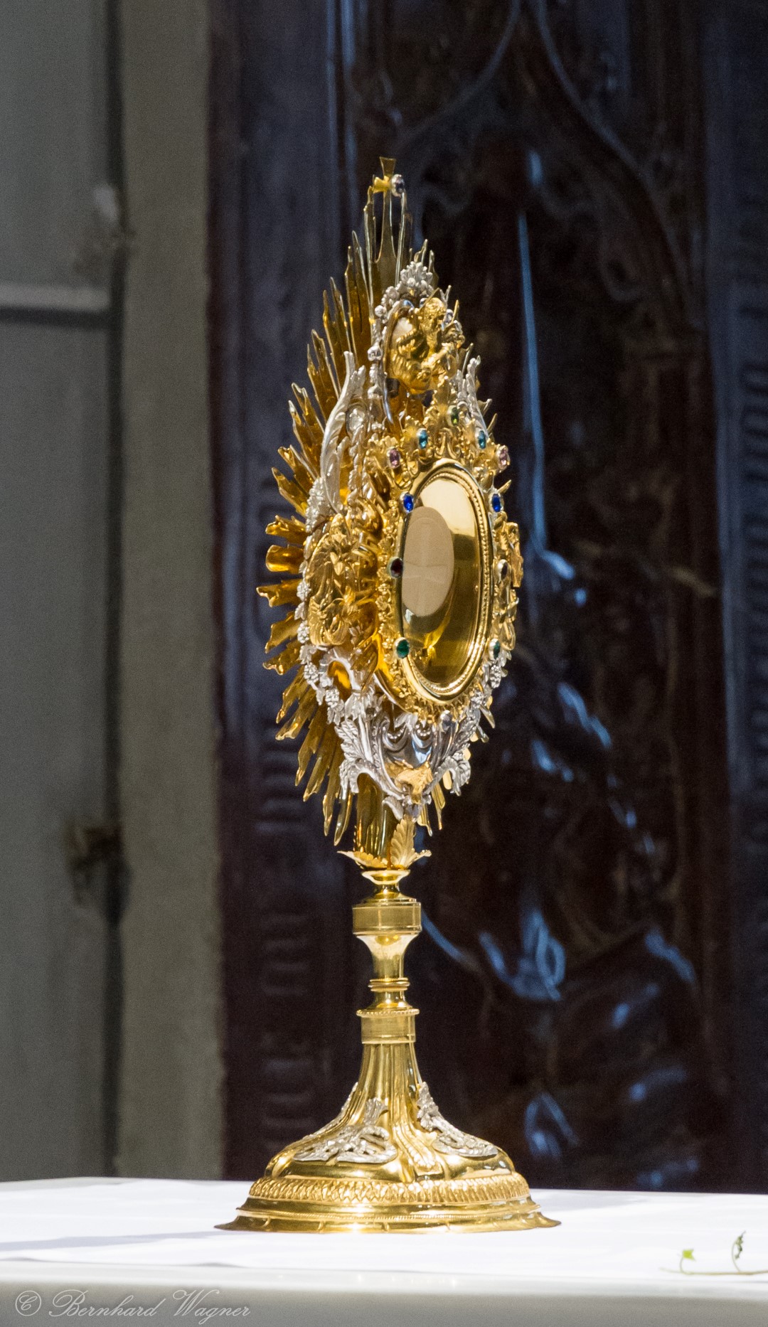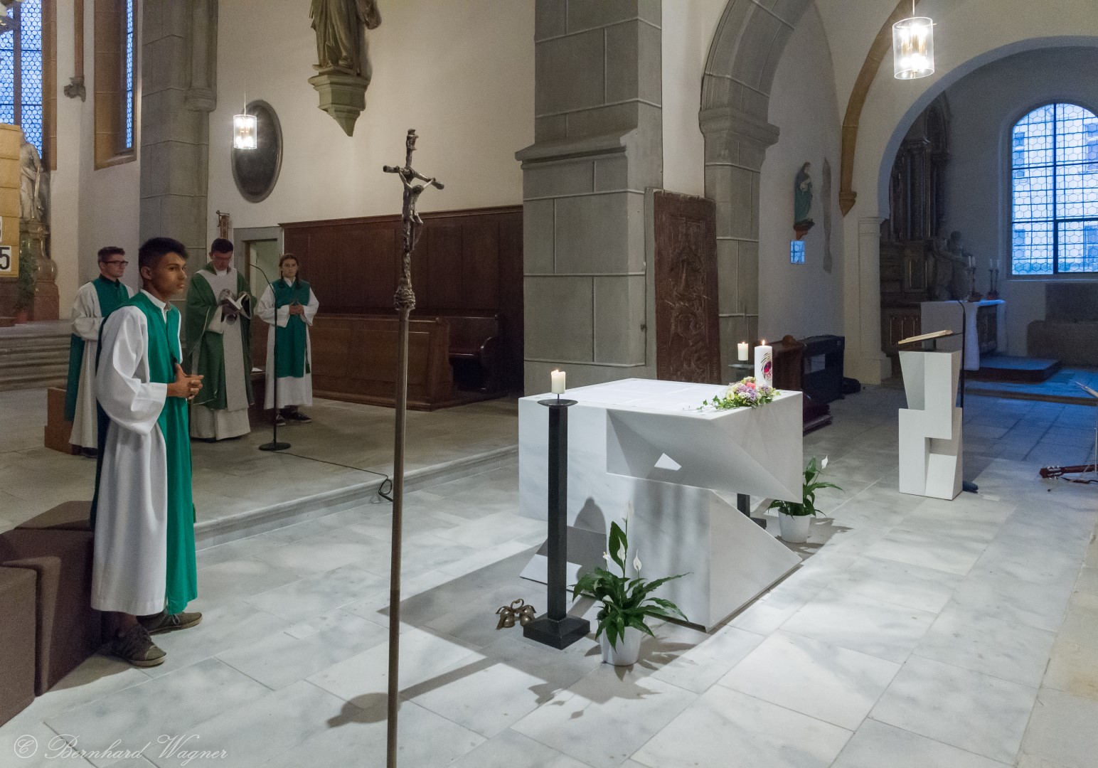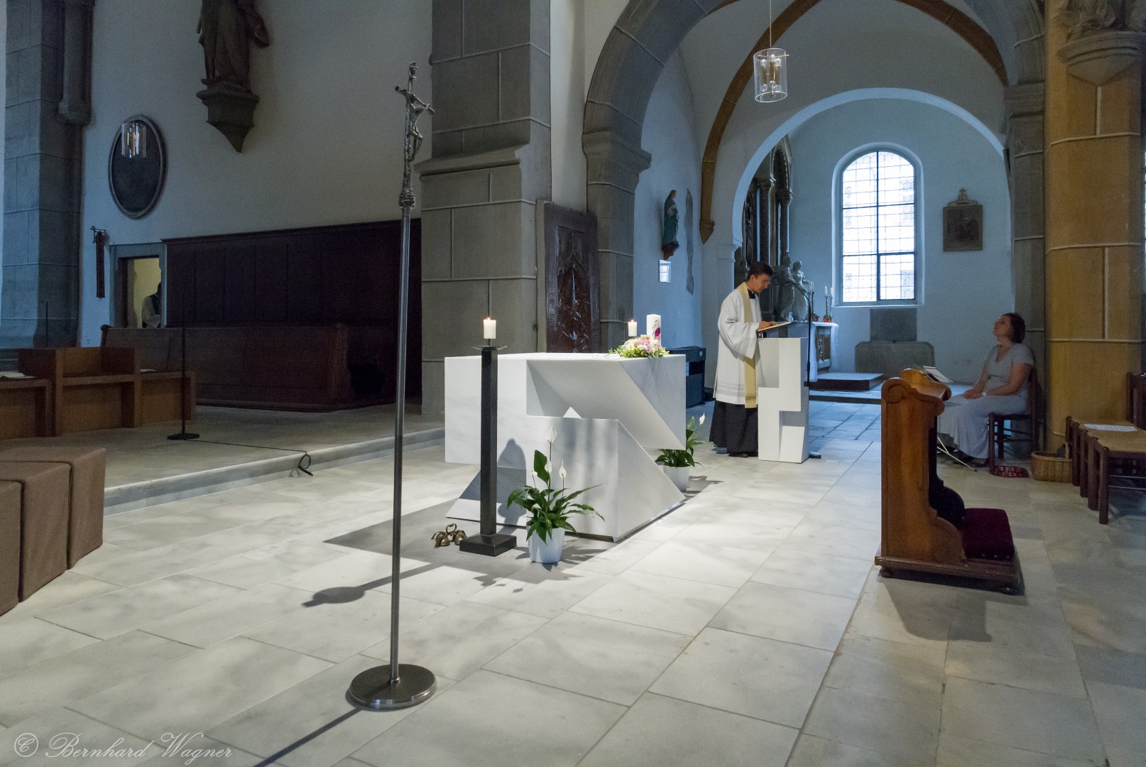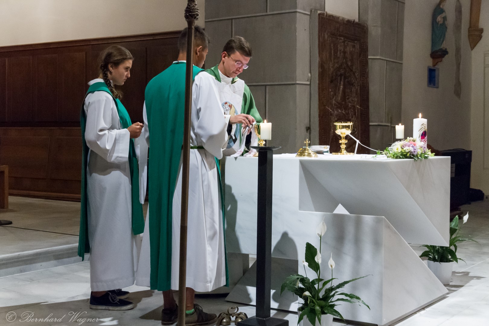 Nach der Begrüßung der anwesenden Gläubigen durch Kaplan Kranicki übertrug er das Allerheiligste in der Monstranz zum Volksaltar und nahm anschließend die Inzens, also eine feierliche Beräucherung, vor. Es folgte die festliche Eröffnung der Feier mit dem bekannten Lied „Großer Gott, wir loben dich”, an der Orgel gespielt durch Organistin Frau Christina Kaufmann, ehe man sich ganz in die Anbetung des Allerheiligsten mit verschiedenen Gebeten, betrachtenden Texten und Liedern vertiefte. Die musikalische Gestaltung übernahm dabei Pastoralassistentin und Krankenhausseelsorgerin Frau Eva-Maria Kölbl-Perner mit verschiedenen Gesängen, u.a. auch solchen aus Taizé, welche sie an ihrer Gitarre begleitete. Zum Abschluss des ersten Teils beteten Jugendliche den Barmherzigen Rosenkranz.