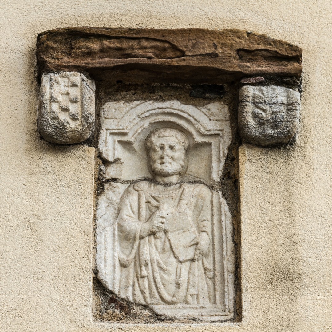 Nordseitig am Turm findet sich dieser Römerstein. Der Mann mit Toga und offenem Buch könnte eine Darstellung des Hl. Markus als Kirchenpatron sein oder aber es handelt sich um das Grabrelief eines römischen Schreibers (© Herr Mag. Bernhard Wagner).