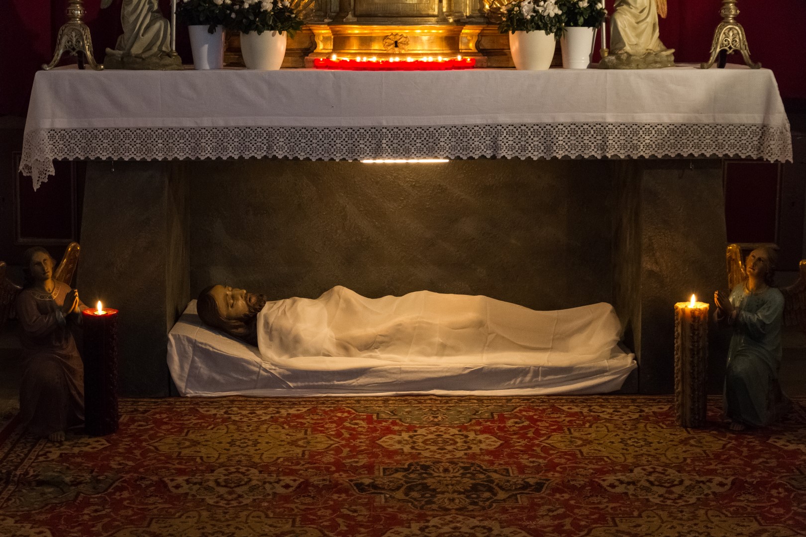 Sie nahmen nun den Leib Jesu und banden ihn samt den wohlriechenden Gewürzen in leinene Tücher, wie die Juden zu begraben pflegen. Es war aber ein Garten an dem Ort, wo Jesus gekreuzigt worden war, und in dem Garten ein neues Grab, in das noch niemand gelegt worden war. Dorthin nun legten sie Jesus, wegen des Rüsttages der Juden, weil das Grab nahe war (Joh 19, 40-42 Schlachter 2000).