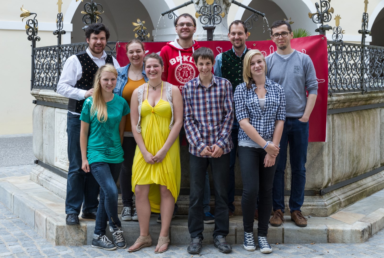 Das Team beim Brunnen im Innenhof des Benediktinerklosters St. Paul im Lavanttal: Hinten von links: Regionaljugendleiter Herr Jakob Mokoru, BEd, Frau Pia Urban, Zivildiener Herr Thomas Hafner, Herr Andreas Prohart und Herr Dražen Marić. Vorne von links: Frau Stephanie Prohart, Frau Monika Loibnegger, Pascal Kogler und Frau Kerstin Streit (© Herr Mag. Bernhard Wagner).
