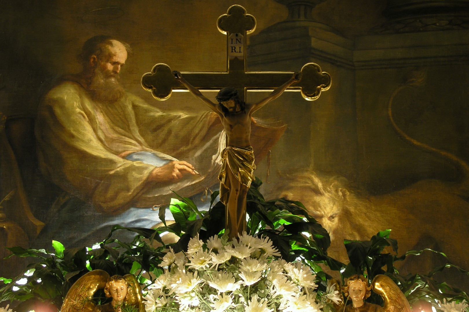 8. November 2014Volle Auflösung (1620 × 1080) ← Vorherige Weiter → Das Hochaltarkreuz in stimmungsvollem Licht. Dahinter der Hl. Markus mit dem Löwen (© Herr Mag. Bernhard Wagner).