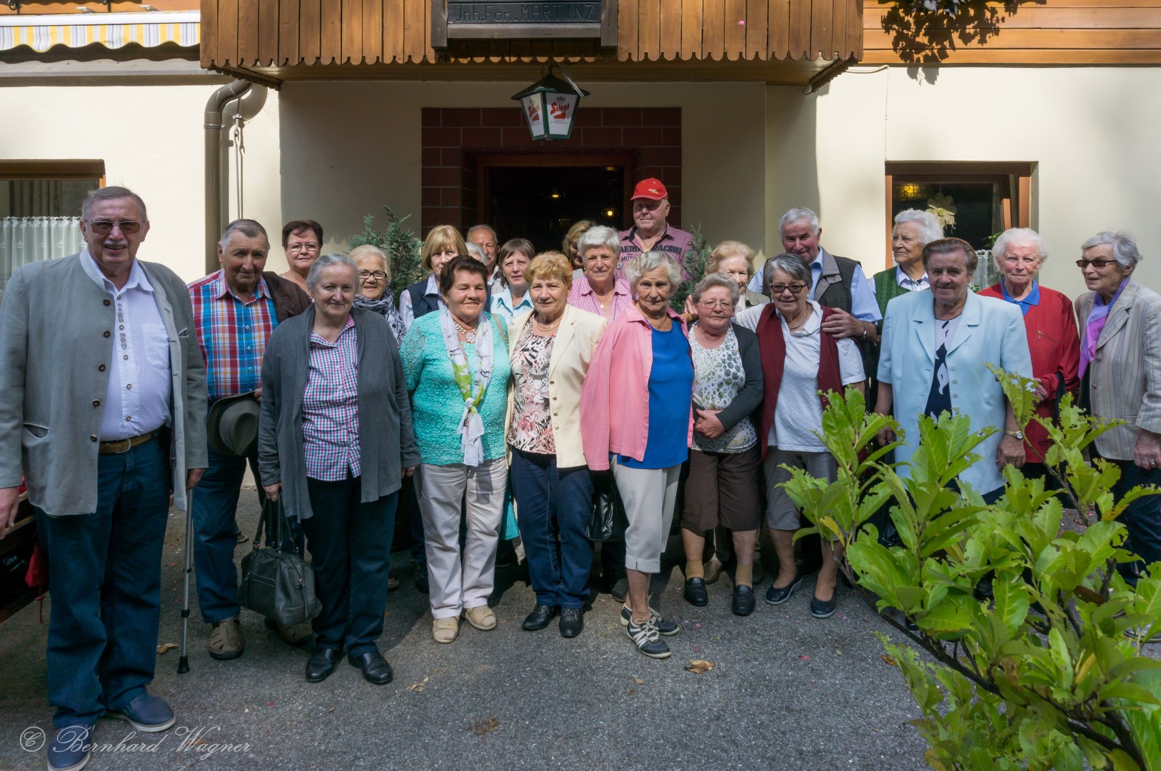Das Seniorenteam zusammen mit Gruppenleiter Herrn Kurt Weitlauer (ganz links) vor dem Eingang zum Gasthof Frasswirt am 20. September 2018