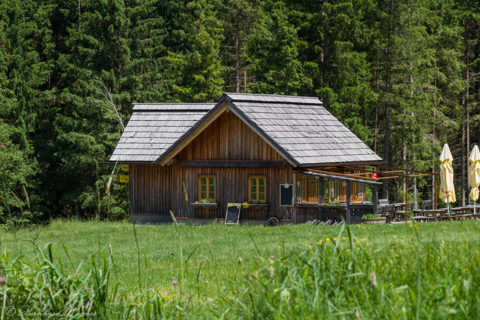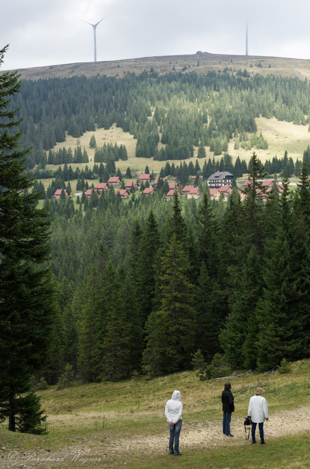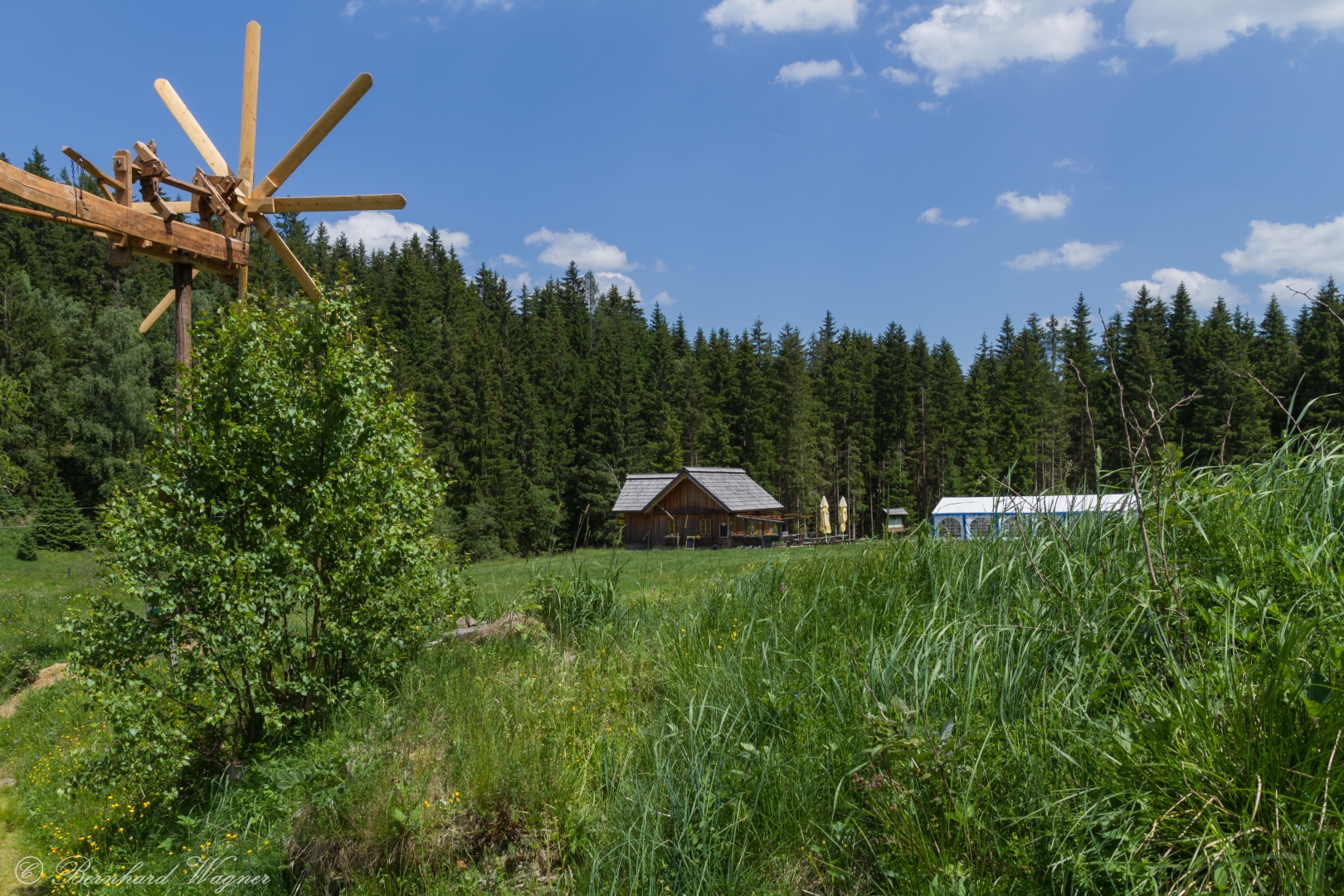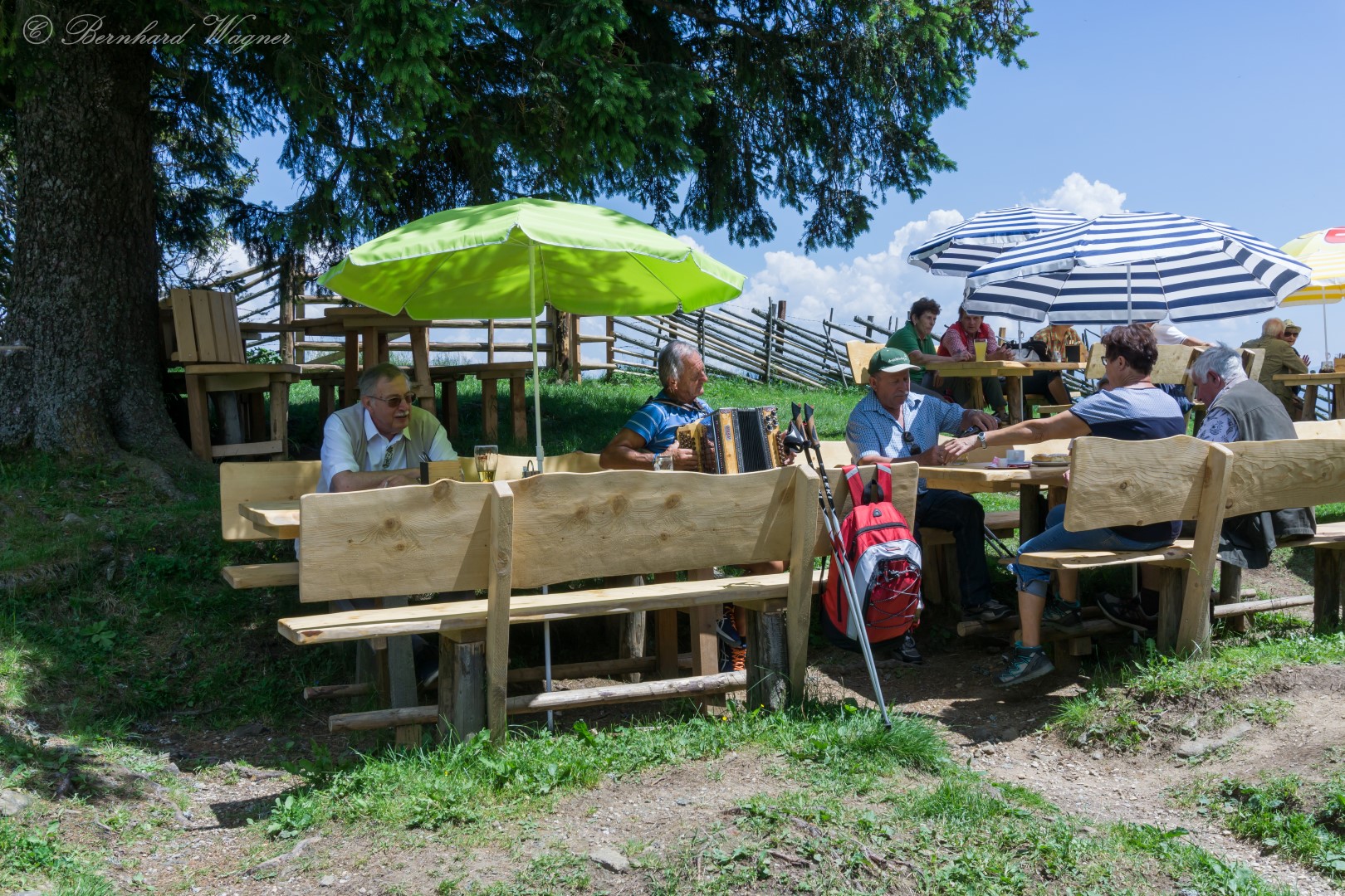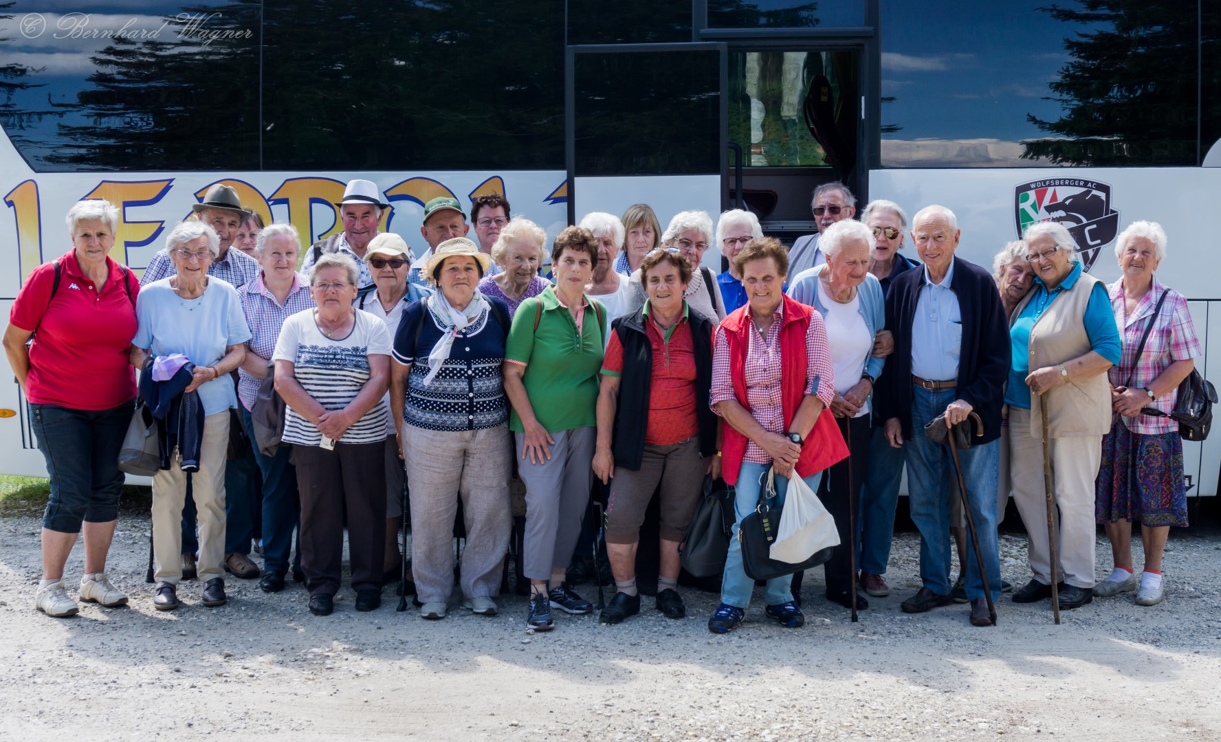 Das Seniorenteam zusammen mit Gruppenleiter Herrn Kurt Weitlauer (hinten vor dem Buseingang) beim Ausflug zur Zechhütte auf die Saualpe am 21. Juni 2018