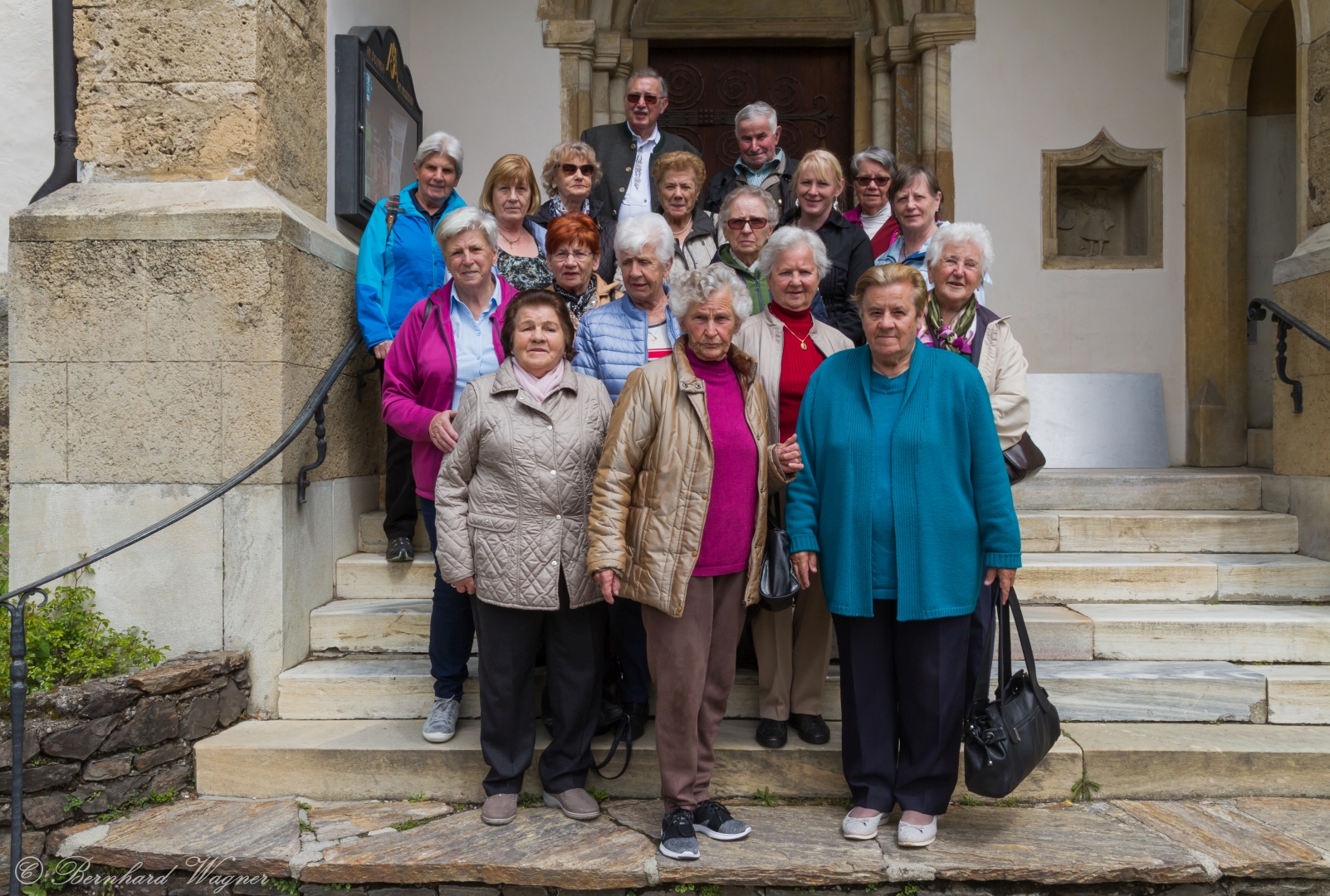 Das Seniorenteam zusammen mit Gruppenleiter Herrn Kurt Weitlauer (links außen) bei der Wallfahrt nach Maria Buch in der Steiermark am 18. Mai 2017, hier vor der Wallfahrtskirche (© Herr Mag. Bernhard Wagner).